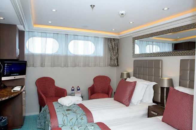 房间窗户不可打开。两张单人床可拼成一张大床,床上用品包括埃及亚麻布、羽绒枕头和羽绒被。房间设有带有喷头淋浴的私人浴室,设施包括 :大衣柜、全身镜、吹风机、保险箱、电话、平板电视(提供免费的电视、电影,音乐图书馆和英语电视台)、免费Wi-Fi、室内温度控制系统、每天免费补充的瓶装水。