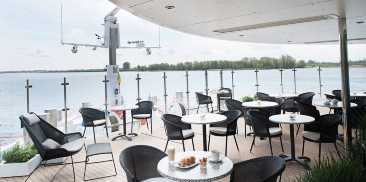 天气舒适的时候,您可以在露台上用餐,位于美丽的地平线甲板船头区域。宁静私密的环境。提供健康的早餐,便餐和饮料。享受凉爽的微风,欣赏河景。